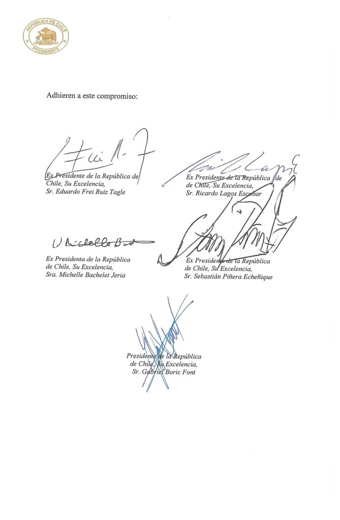 Boric, Bachelet, Lagos, Frei y Piñera firman compromiso