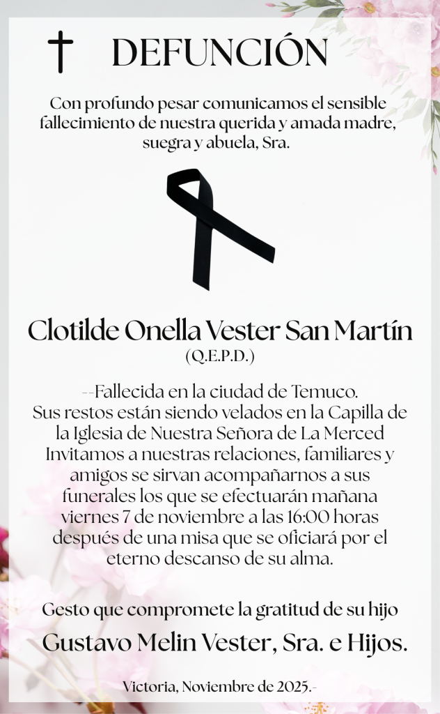 Con profundo pesar comunicamos el sensible fallecimiento de nuestra querida y amada madre, suegra y abuela, Sra. Clotilde Onella Vester San Martín (Q.E.P.D.) –Fallecida en la ciudad de Temuco. Sus restos están siendo velados en la Capilla de la Iglesia de Nuestra Señora de La Merced Invitamos a nuestras relaciones, familiares y amigos se sirvan acompañarnos a […]