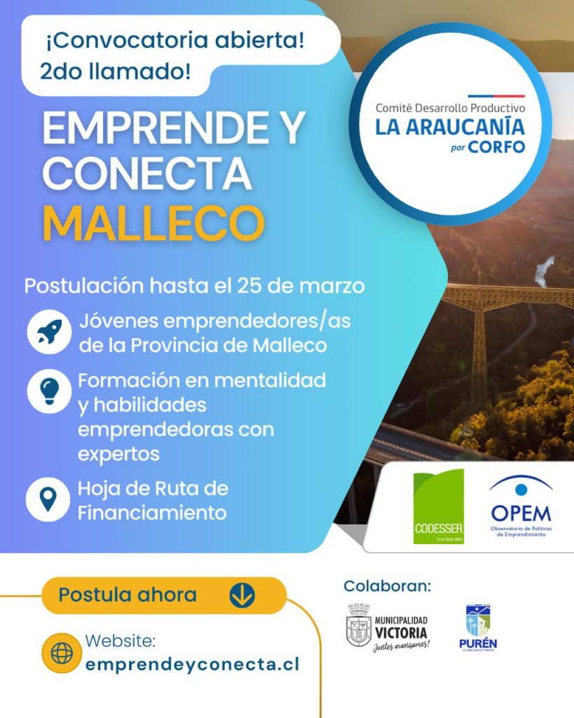 El programa “Emprende y Conecta Malleco”, iniciativa respaldada por el Comité Productivo de La Araucanía de Corfo y ejecutada por Codesser, dio a conocer a sus primeros 15 emprendedores seleccionados en el marco del primer llamado. Los jóvenes, provenientes principalmente de Victoria, Traiguén y Purén, fueron escogidos entre más de 60 postulaciones.