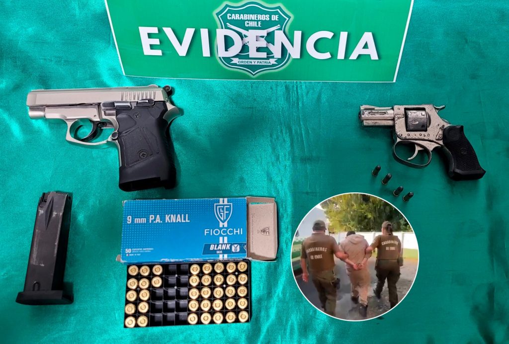 Carabineros del Retén Tijeral incautaron un revólver calibre .22, una pistola de fogueo y munición tras acudir a un llamado por disparos en la vía pública.